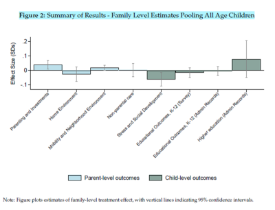 - The study found no statistically significant effects (after adjusting for the possibility of false discoveries) on any of the family-level, composite outcomes that the authors had prespecified as “top tier” – which comprise the most reliable findings in the paper. These composite outcomes are: